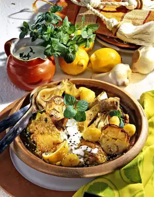 Wash the mint and dab dry. Put half of the mint aside for the sauce. Cut lemon half into slices. Put everything together with the chicken pieces into an Arabic clay pot or a Roman pot. Add broth and lemon juice, except for something for the yoghurt sauce. Cook in the preheated oven (electric cooker: 200 °C/ gas: level 3) with closed lid for about 1 1/4 hours. 30 minutes before the end of the cooking time, remove the lid, turn the temperature up (electric oven: 225 °C/ gas: level 4) and continue cooking. In the meantime, mix yoghurt, milk and some lemon juice. Season to taste with salt, pepper and sugar. Cut remaining mint leaves into fine strips and stir into the sauce.