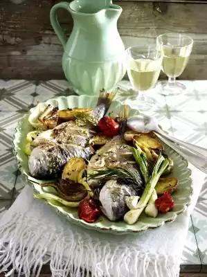 Clean and wash the spring onions. After about 40 minutes, place the giltheads and spring onions on the vegetables. Spread the rest of the rosemary and thyme on the fish and vegetables and fry together for another 25 minutes.