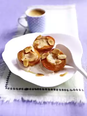 Roast the almonds in a pan without fat until golden brown, take them out. Mix crème fraîche, sugar and vanilla pulp. Remove the apricots from the oven, sprinkle with almonds. Spread the crème fraiche on 4 plates and arrange 3 apricot halves on each