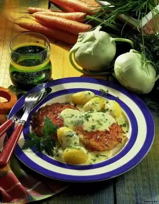 Heat some oil in a frying pan and fry the kohlrabi slices for about 2 minutes while turning. Arrange on plates with sauce and potatoes. Serve sprinkled with parsley and garnished.