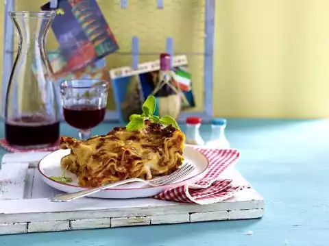 Spread 2 tablespoons of fat in flakes over it. Bake in the preheated oven (electric oven: 200°C/circulating air: 175°C/gas: level 3) for 45-50 minutes. Serve and garnish with oregano. Drink tip: dry red wine, e.g.