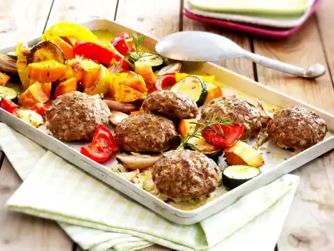 Wash, clean and slice the zucchini. Peel shallots and cut them into slices. Season vegetables with salt and pepper. After about 20 minutes spread them on the meatball tray and drizzle with oil.
