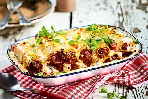 Mix minced meat and carrot mixture. Season with salt and pepper. Fill the cannelloni with the mixture and place in a greased casserole dish. Put the rest of the filling in the baking dish. Pour sauce over it. Grate cheese finely and sprinkle over it. Bake in a preheated oven (electric cooker: 200 °C/circulating air: 180 °C/gas: see manufacturer) for 30-35 minutes.