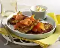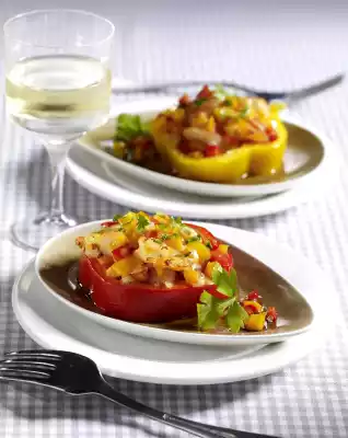 Place the rings in a small casserole dish. Fill with the pepper chili shrimps. Pour sauce over them. Bake in the preheated oven (electric cooker: 200 °C/ convection oven: 175 °C/ gas: level 3) for about 8 minutes.