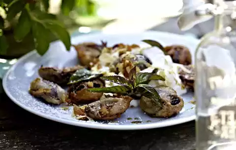Arrange tempura plums with cloudy curd cheese, mint, almonds and icing sugar.