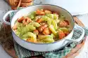 Wash the potatoes, peel if necessary and cook for about 20 minutes. Clean, wash and roughly chop the peppers. Peel and chop onion and fry in 1 tbsp. hot oil. Steam the bell peppers briefly. Add 5 tablespoons of water, bring to the boil, cover and simmer for about 10 minutes.
