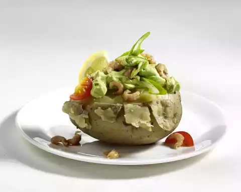 Remove the potato, wrap it from the foil, cut it lengthwise in the middle and press it apart. Add avocado cream and garnish with leek and onion rings, remaining crab, lemon wedges and tomato wedges.