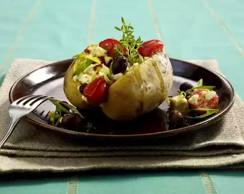 Crumble the feta cheese, mix everything with olives and oil. Drain the potatoes, rinse with water, cut lengthwise and press them apart a little. Put the potatoes on a baking tray and fill with the cheese mixture. Bake in the preheated oven (electric cooker: 200 °C/ convection oven: 175 °C/ gas: level 3) for 5-10 minutes. Arrange the baked potato on a plate and garnish with thyme