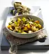 Wash the potatoes and cook in boiling water for about 30 minutes. Wash tomatoes, dab dry, cut in half. Clean and wash spring onion and cut it diagonally into rings. Wash thyme, dab dry. Put something aside for garnishing. Pluck the remaining leaves from the stems.