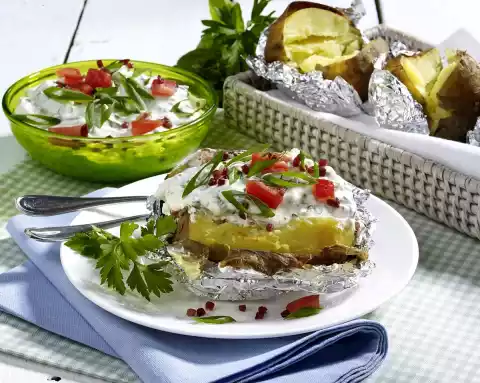 Heat the oil in a small, coated pan. Leave the ham in it until crispy. Remove the potatoes, wrap them in foil and let them cool down a little. Cut the potatoes lengthwise in the middle, press them apart and add the herb curd cheese.