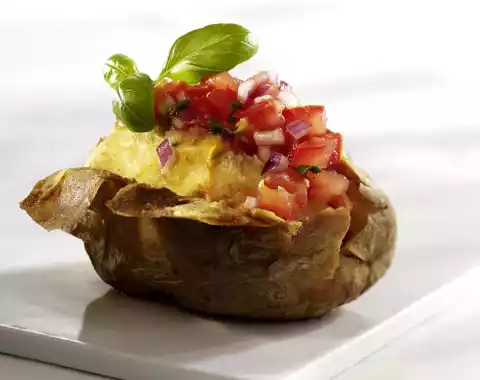 Wash the potatoes, wrap in aluminium foil and bake in a preheated oven (electric cooker: 200 °C/ convection oven: 175 °C/ gas: level 3) for approx. 1 1/2 hours. In the meantime wash, clean and dice the tomatoes.