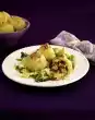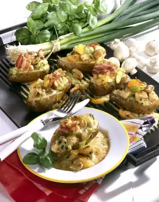 Cut the potatoes in half and place them in a flat roasting pan or on a baking tray. Spread the ragout on top. Grate cheese over it. Bake in a hot oven (electric cooker: 200 °C/circulating air: 175 °C/gas: level 3) for 10-15 minutes. Garnish with bacon