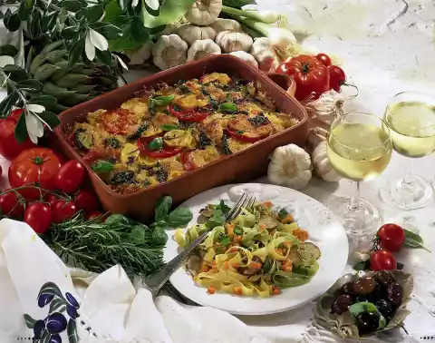Sprinkle each layer with salt, pepper, grated cheese and breadcrumbs. Drizzle with olive oil and add 75 ml water. Cook in the preheated oven (electric cooker: 175 °C/ gas: level 2) for about 1 1/4 hours. Serve garnished with fresh basil