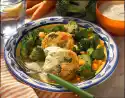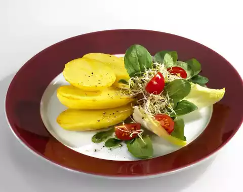 Wash the potatoes and cook for 15-20 minutes. Then rinse cold, peel and cut into thick slices. Place on a baking tray and sprinkle with salt and pepper. Melt the fat and spread it on the potatoes. Bake in the preheated oven (electric cooker: 225 °C/ convection oven: 200 °C/ gas: level 4) for 5-10 minutes. In the meantime, wash the chicory, lettuce, sprouts and tomatoes.