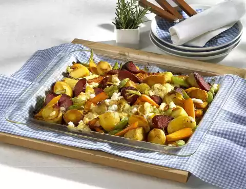 In the meantime clean, wash and cut the celery into pieces. Halve the cabanossi and cut into pieces. After 30 minutes add cabanossi and celery to the baked potatoes, crumble the feta cheese over it and cook until done.