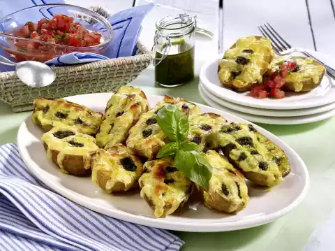 Add vinegar and oil and season to taste with salt, pepper and sugar. Remove the potatoes and let them cool down briefly. Cut cheese into strips. Spread the pesto on the potatoes and cover with cheese in a grid pattern.