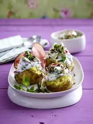 Take the potatoes out of the oven and break them open. Serve with feta yoghurt and ham, sprinkle with the sprout mixture and garnish with the rest of the parsley. Add the remaining yoghurt.