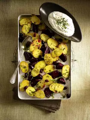 Spread potatoes and beetroot on a baking tray coated with oil and season with 1-2 tablespoons of salt. Roast in the preheated oven (electric cooker: 200 °C/ convection oven: 175 °C/ gas: level 3) for 30-40 minutes. Distribute the olives on top about 15 minutes before the end of the cooking time.