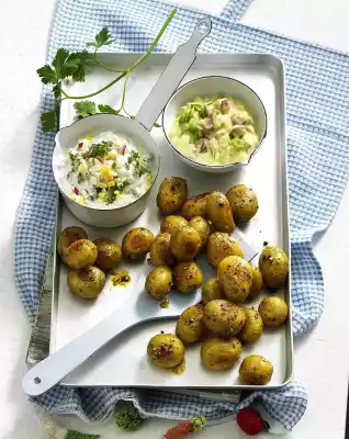 Wash the potatoes thoroughly and let them drain. Mix oil, sweet paprika, dried parsley, some pepper and sea salt and mix with the potatoes in a bowl. Place on a lightly oiled baking tray or fat pan and bake in a preheated oven (electric range: 200 °C/ convection oven: 175 °C/ gas: level 3) for 40-45 minutes. Turn once in between. Meanwhile, for the sauces, pierce the egg and boil in boiling water for about 10 minutes until hard. Rinse under cold water and let cool down.