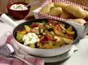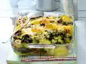 Take out the potatoes and break each one in half. Spread leek and mushroom cream over them. Sprinkle cheese over it. Add potatoes.
