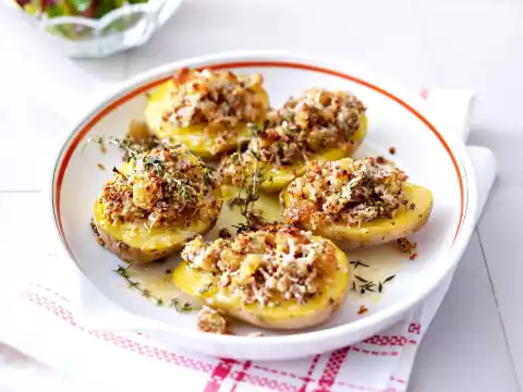 Preheat oven (electric cooker: 200 °C/circulating air: 175 °C/gas: see manufacturer). Drain potatoes, quench briefly and cut in half lengthwise. Place potatoes on a baking tray with the cut surface facing upwards.