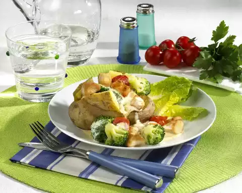 Take the potatoes out of the oven, cut a cross in the top and press them apart a little. Arrange potatoes and ragout on plates. Serve garnished with romaine lettuce.