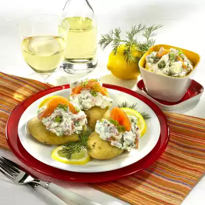 Wash the potatoes carefully, dab dry and place on a baking tray. Cook in the preheated oven (electric cooker: 200 °C/ convection oven: 175 °C/ gas: level 3) for approx. 50 minutes. In the meantime clean and wash spring onions and cut them into fine rings. Wash and chop the dill. Cut 2 slices of salmon into fine strips. Mix cream cheese and crème fraîche.