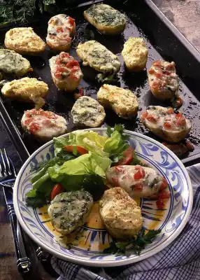 Mix cream cheese, garlic, peppercorns and egg yolk. Grate Gouda coarsely. Wash the herbs, except for a few leaves for the salad, chop and mix with the Gouda. For the third cheese mixture, wash the tomatoes and remove the stalk. Halve 2 tomatoes, remove seeds and cut into small cubes. Also dice the gorgonzola and mix with the diced tomatoes. Spread the cheese mixture on the potato slices and bake for another 15 minutes. Clean, wash and drain the lettuce and cut into bite-sized pieces. Cut the remaining tomatoes into narrow slices. Mix well vinegar, some salt and pepper, add remaining oil.