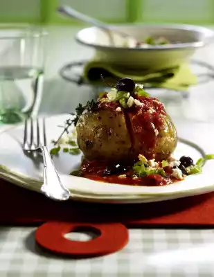 Drain the olives. Sheep's cheese crumbles. Season the sauce again. Wrap potatoes out of the foil, press them apart so that they break open at the cuts. Pour sauce into the potatoes, add remaining sauce extra.
