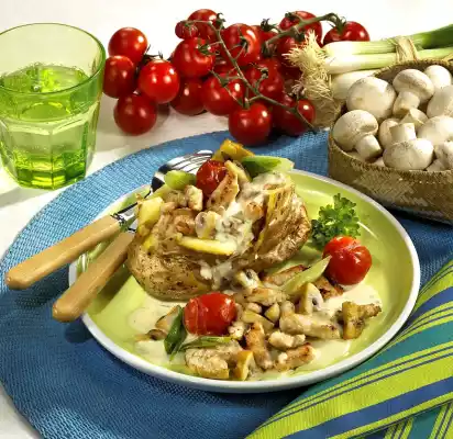 Wash the potatoes, grate them dry, brush them with olive oil and place them on a baking tray. Bake in the preheated oven (electric cooker: 200 °C/ convection oven: 175 °C/ gas: level 3) for about 1 1/4 hour. In the meantime clean and wash spring onions and cut them into rings. Wash parsley, dab dry and chop finely. Clean, wash and quarter the mushrooms.