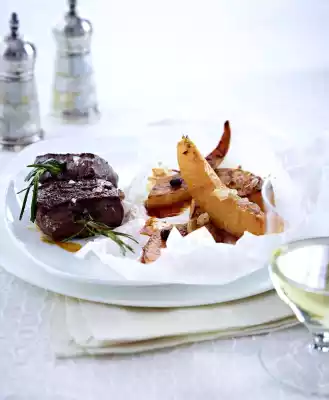Cut the fat and tendons from the lamb salmon. Cut rosemary twigs into skewers of equal length. Skewer 2 pieces of meat on each skewer. Heat the oil in a pan, fry the meat skewers on all sides and cook over a low to medium heat for about 10 minutes. Take the pumpkin parcels out of the oven and arrange with the meat on plates