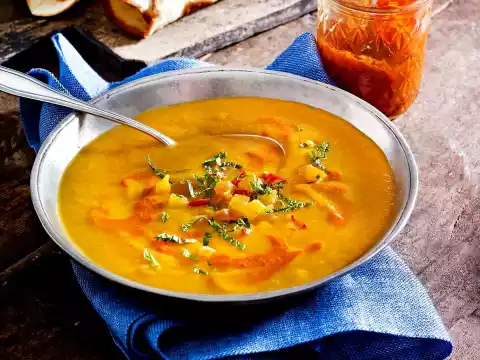 Remove the roaster from the oven. Add 2-3 teaspoons Harissa. Puree the mixture finely. Possibly add approx. 200 ml broth. Season to taste with salt, pepper and cumin. Stir 1 tsp Harissa with 3 tbsp water until smooth. Sprinkle the soup with it, sprinkle with apricot mixture. Flatbread tastes good with it