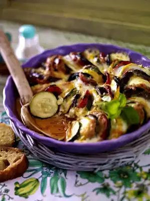 Grind the mozzarella finely. Remove aluminium foil and sprinkle on vegetables. Bake at the same temperature for another 15 minutes. Garnish with basil. Add toasted baguette bread