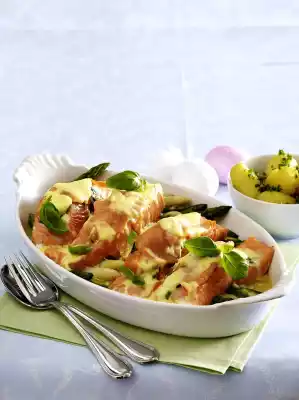 Wash the basil, shake dry and pluck the leaves from the stalks. Place the asparagus in a greased baking dish and pour half the sauce over it. Place salmon slices on top. Arrange basil leaves on the slices, except for a few for garnishing. Place the smoked salmon on top and pour the rest of the sauce over it