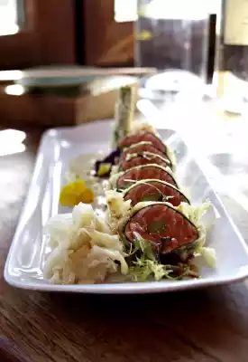 Line a bamboo mat with cling film. Cut nori leaves in half lengthwise. Place each 1⁄2 nori leaf on the bamboo mat with the rough side facing upwards. Put 1 filled piece of salmon on top. Roll up firmly using the bamboo mat. Do not wrap up the foil. Form 4 rolls in this way. Flour the rolls and turn them over at high temperature.