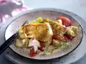 For the Tempura dough, mix 100 g Tempura flour, egg yolk and 1⁄4 l cold water. Do not stir too hard, the dough may be a little lumpy. Put it in the fridge, then it will be nice and crispy when baked out. For the sesame cream mix mayonnaise, soy sauce and sesame oil