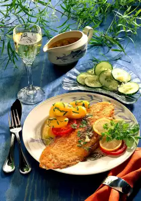 Peel the potatoes and cook in salted water for 20 minutes. In the meantime, wash the fish and pat dry. Sprinkle with lemon juice. Beat the egg with salt and some pepper. Turn sole in egg and breadcrumbs one after the other.