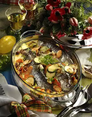 Cover and simmer for about 3 minutes. Wash the trout thoroughly and sprinkle some salt and pepper into the belly. Put 2/3 of the vegetable mixture into an ovenproof dish and place the trout on top. Pour the rest of the vegetables with the stock and bake in a preheated oven (electric range: 200 °C / gas: level 3) for approx. 30 minutes. Sprinkle with remaining chervil and serve garnished. Boiled potatoes taste good with it