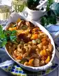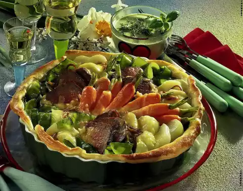 Cut the meat into slices. Lift the baking paper with the dried peas out of the tin. Spread vegetables and meat on the dough and sprinkle with cheese. Bake the vegetables in a preheated oven (electric cooker: 200 °C/ gas: level 3) for 15-20 minutes.