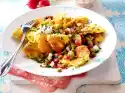 Meanwhile peel and finely dice the onion for the salsa. Clean, wash and finely dice the tomatoes. Mix onions and tomatoes. Mix with salt, pepper, sugar and vinegar. Season with Tabasco. Mix in oil