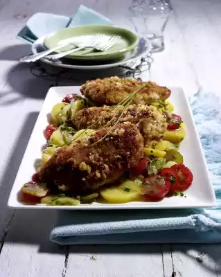 Season the potatoes with salt, pepper and sugar. Mix in cucumbers, chives and tomatoes, mix carefully and season again with salt, pepper and sugar. Arrange potato salad and chicken on a plate.