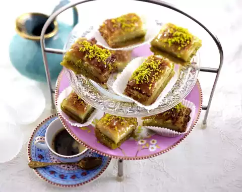 Take the baklava out of the oven and immediately pour the hot syrup evenly over it. Let it cool down. Sprinkle with the remaining pistachios before serving. Serve with a strong black mocha.