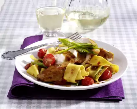 Wash and halve the tomatoes. Clean and wash spring onions and cut them into pieces of about 5 cm length. Wash the meat, dab dry and season with salt. Prepare pasta in boiling salted water according to package instructions.
