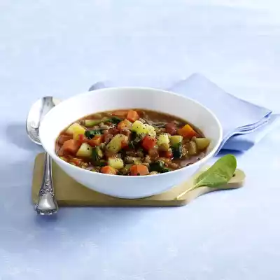 Approximately 10 minutes before the end of cooking, add diced carrots and potatoes and season to taste with salt, pepper and vinegar. Add spinach 2-3 minutes before cooking. Stir the starch and 2 tablespoons of water until smooth and use to thicken the stew, bring to the boil and serve.