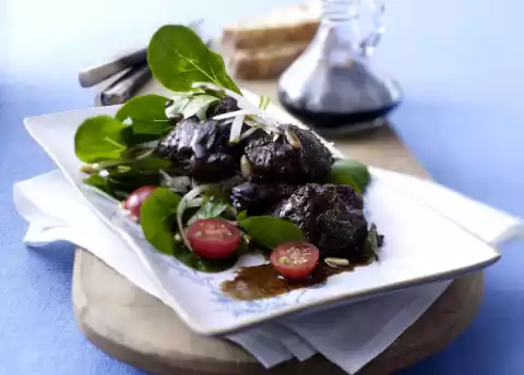 Heat 2 tablespoons of oil in a frying pan. Fry the liver in it over medium heat for 2-3 minutes on each side. Fry the sage briefly. Season everything with salt and pepper. Deglaze with balsamic vinegar and 4 tbsp. water and bring to a boil.