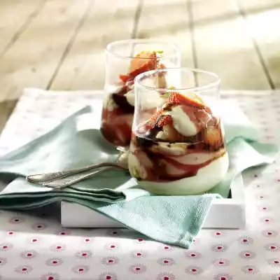 Quarter the other half. Shortly before serving, layer the mascarpone cream, strawberries, fruit puree and balsamic cream in glasses and decorate with 1/2 strawberry each.