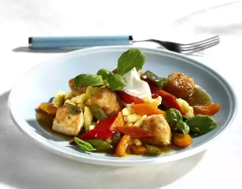 Cook the spaetzle in boiling salted water for about 8 minutes. In the meantime wash turkey breast, dab dry, cut into large cubes and turn in flour. Peel and finely dice the onion. Clean, wash and cut the bell peppers into rhombs.