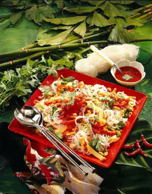 Peel garlic and press through a garlic press. Cook the noodles in boiling salted water for about 1 minute, drain, quench and let them cool down. Roast peanuts in a dry pan, remove from the pan and put aside. Heat 2 tablespoons of peanut oil in a frying pan and fry the carrots, peppers, Chinese cabbage, bamboo, corn and garlic for 3-4 minutes while turning. Remove the vegetables from the pan and let them cool down. Wash the coriander, dab dry and pluck the leaves from the stems. Wash the chilli pepper, remove seeds and cut into rings. Mix the remaining oil, sugar, lime juice, sambal oelek, ketchup, chilli rings, vinegar, salt and pepper. Mix vegetables, glass noodles and peanuts. Arrange on a plate with the coriander green.