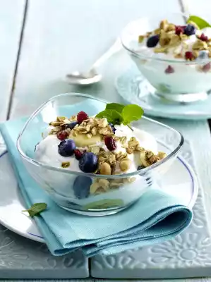 Select the blueberries, wash and drain well. Peel and slice the bananas. Mix the fruit with the quark, except for something to decorate. Arrange the quark in small bowls.