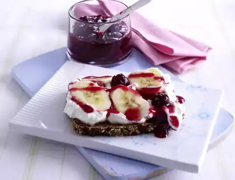Spread slices of bread with quark. Peel and slice the banana and spread on the quark. Drizzle cherry jam on top.